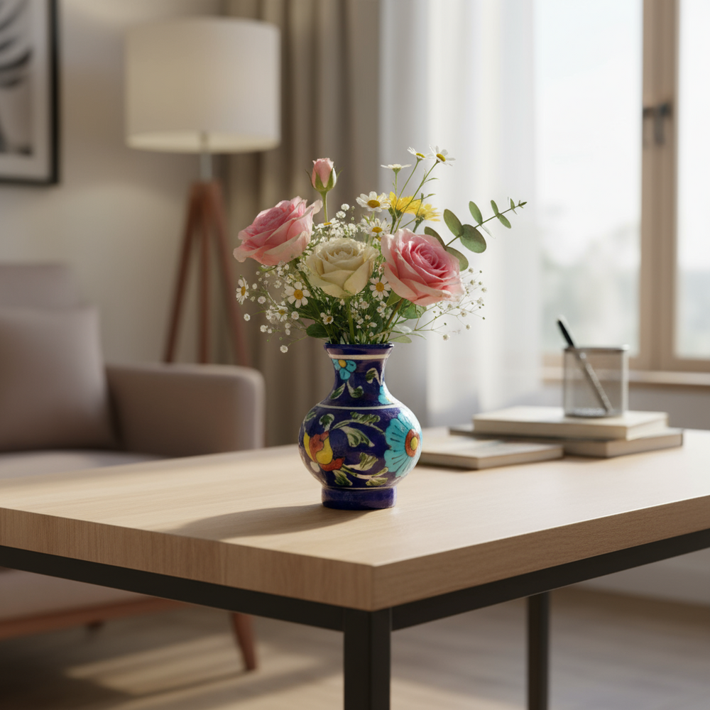 Blue Pottery of Rajasthan is one of India’s most distinctive and visually captivating traditional crafts, known for its striking cobalt blue designs and intricate floral motifs. Originating in Jaipur, this art form beautifully fuses Persian, Turkish, and Mughal influences, creating a timeless legacy of glazed ceramic work. Unlike other pottery styles, Blue Pottery is made from a unique quartz-based composition instead of traditional clay, making it lighter and more delicate. Artisans use a blend of quartz stone powder, glass powder, Multani mitti (Fuller’s earth), gum, and water to create the base, which is then glazed and fired at a low temperature.