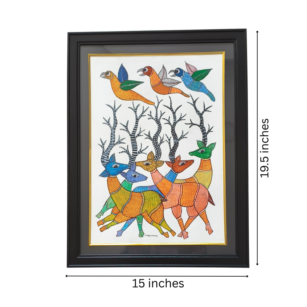 Gond Art, a vibrant and intricate form of tribal painting, originates from the Gond tribe, one of the largest indigenous communities of central India, particularly concentrated in the Dindori district of Madhya Pradesh. Traditionally drawn on walls and floors during festivals and rituals, Gond art has evolved into a celebrated form of contemporary folk expression, especially since the late 20th century.