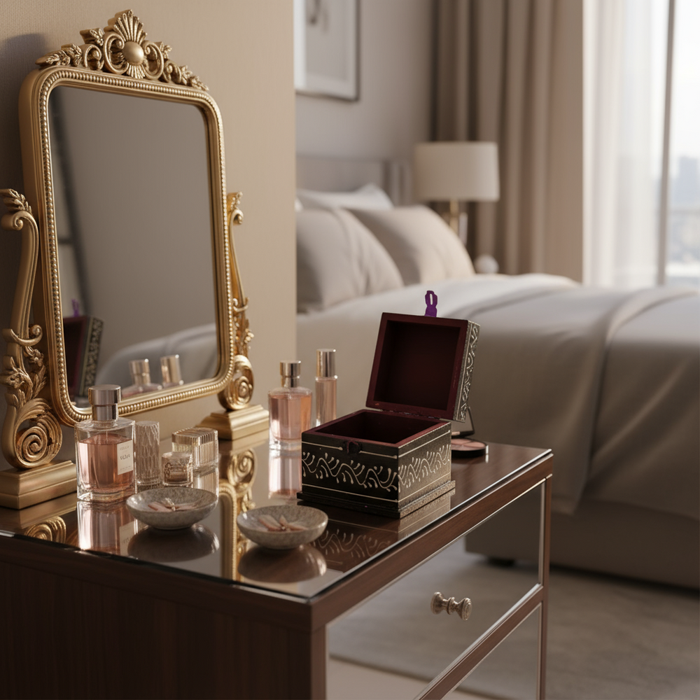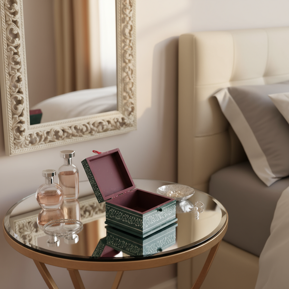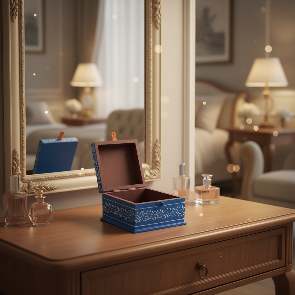 Each piece is meticulously carved from high-quality Sheesham (Indian Rosewood) or Mango Wood, known for durability and beautiful natural grain. The detailed hand-carved patterns showcase floral motifs, royal elephants, peacocks, and temple-inspired designs, capturing the essence of Rajasthani tradition and royal craftsmanship.