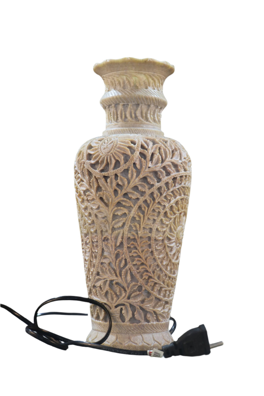 The stone is hand-chiselled to create delicate, symmetrical designs.