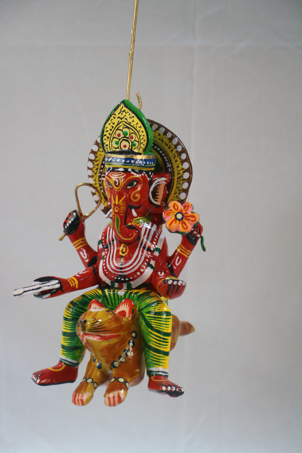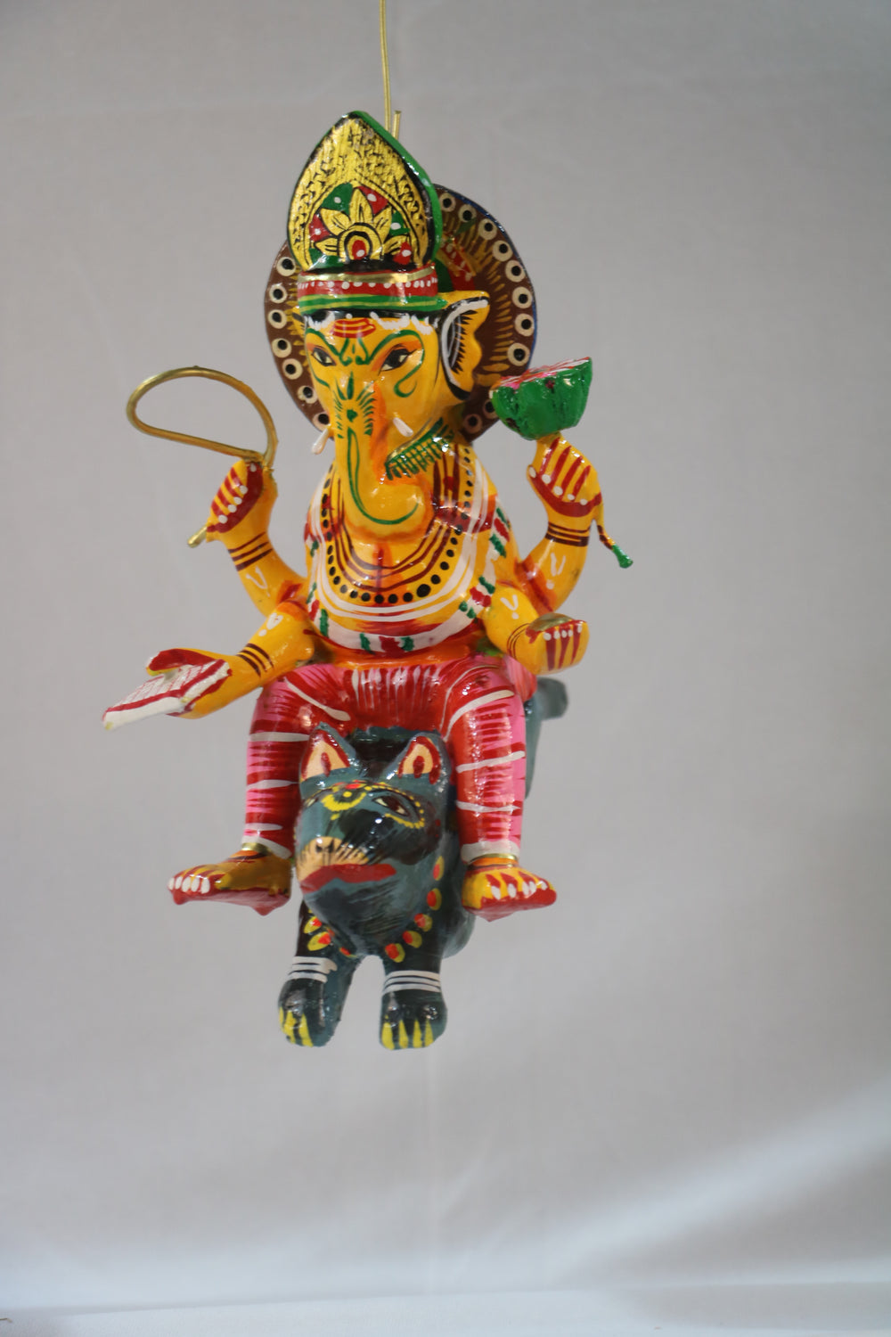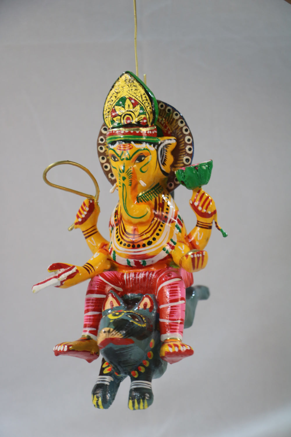 This image showcases a vibrant, handcrafted artifact depicting Panchamukhi Hanuman, a five-faced form of the Hindu deity. The central and most prominent face is that of Hanuman, with the other four heads of different deities branching out to the sides. It appears to be a hanging ornament or a wall decoration, likely carved from wood. The entire piece is brightly painted with intricate details, especially on the crowns and attire, reflecting a traditional Indian folk art style. The deity is shown with multiple arms, in a dynamic and powerful pose. The use of bold colors and detailed patterns gives the object a lively and sacred appearance.