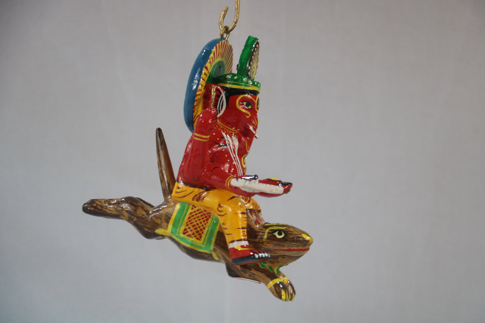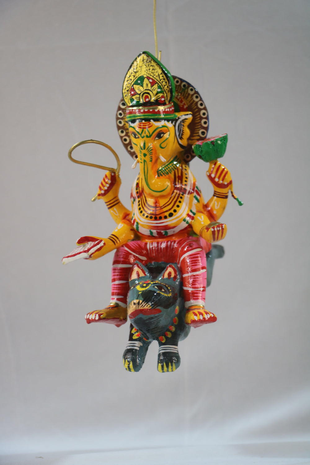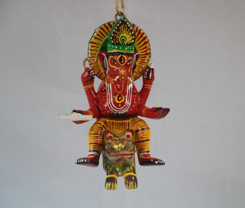 This image showcases a vibrant, handcrafted artifact depicting Panchamukhi Hanuman, a five-faced form of the Hindu deity. The central and most prominent face is that of Hanuman, with the other four heads of different deities branching out to the sides. It appears to be a hanging ornament or a wall decoration, likely carved from wood. The entire piece is brightly painted with intricate details, especially on the crowns and attire, reflecting a traditional Indian folk art style. The deity is shown with multiple arms, in a dynamic and powerful pose. The use of bold colors and detailed patterns gives the object a lively and sacred appearance.