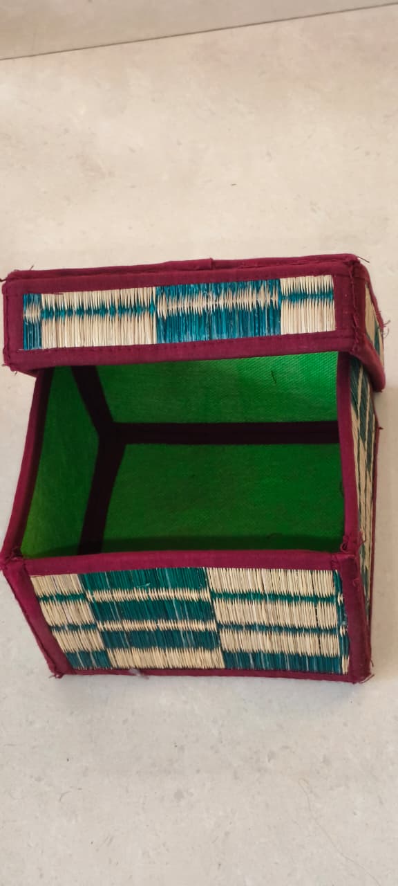 Pattamadai in Tamil Nadu, Pattamadai Boxes, also known as “Pattu Pai”, are a traditional form of floor mat made from Korai grass (a type of river grass). These mats are celebrated for their fine texture, artistic patterns, and durable craftsmanship, reflecting centuries of cultural heritage and skilled artistry.