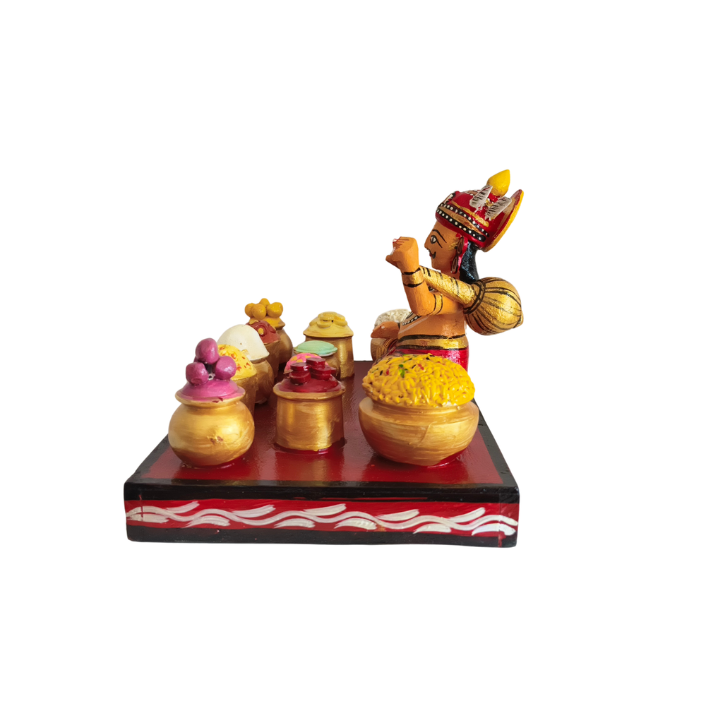 Kondapalli Bommalu are one of the most celebrated traditional wooden toys of India, originating from Kondapalli village in the Krishna district of Andhra Pradesh. These toys are handcrafted from a special softwood known locally as Tella Poniki, which grows in the nearby Kondapalli hills. The craft has a rich heritage dating back over 400 years, believed to have been introduced by migrant artisans from Rajasthan who brought with them unique wood-carving techniques. Each toy is made with meticulous skill, beginning with carving the wood into desired forms, followed by assembling, polishing, and finally painting with vibrant natural or vegetable dyes. The artisans, called Aryakshatriyas, have preserved this tradition for generations, passing it down as a hereditary craft. Kondapalli Bommalu are known for their lively themes inspired by mythology, village life, animals, birds, and deities, reflecting the cultural ethos of Andhra Pradesh. They are most prominently displayed during the festival of Sankranti and Navaratri, especially in the traditional “Bommala Koluvu” (doll arrangement). The toys are lightweight, eco-friendly, and crafted with an aesthetic that blends simplicity with folk charm.Kondapalli Bommalu represent not only the creativity of rural artisans but also a sustainable art form deeply rooted in Indian tradition. Over centuries, the craft has adapted while retaining its original soul, and today, these dolls are treasured as heritage collectibles and cultural symbols worldwide. They embody a timeless legacy where wood, color, and imagination come together to narrate the tales of Indian tradition, art, and spirituality.