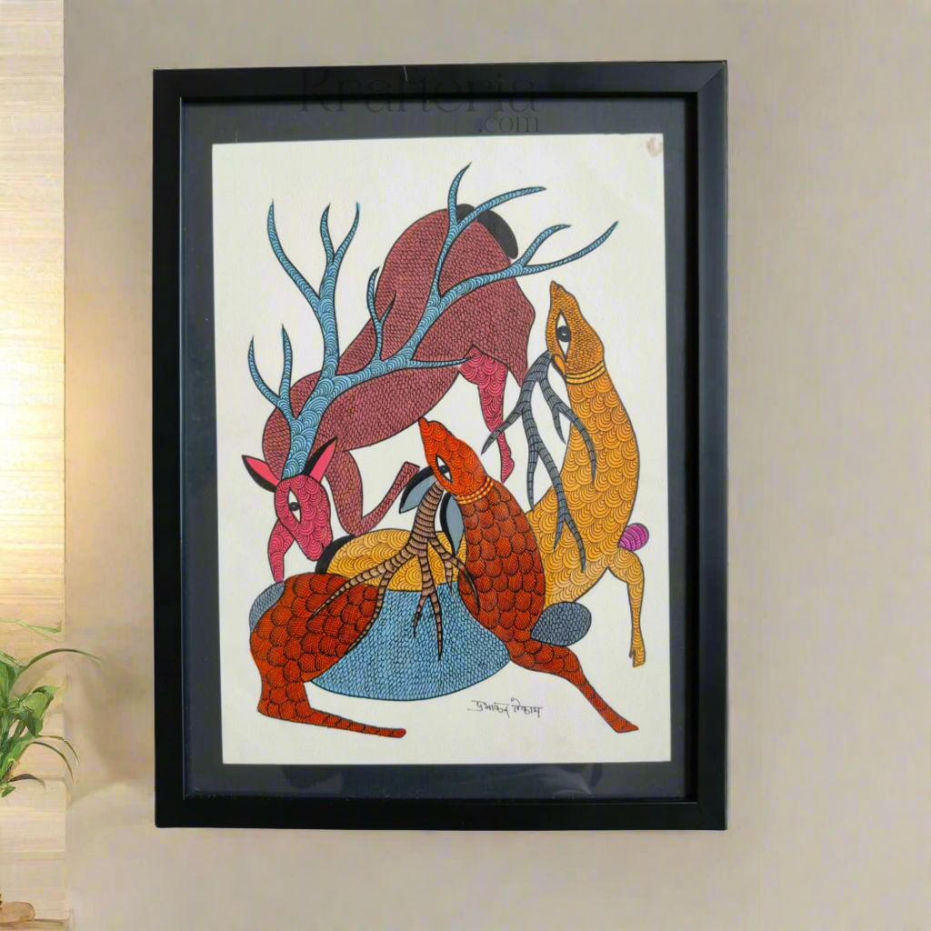 Gond Art, a vibrant and intricate form of tribal painting, originates from the Gond tribe, one of the largest indigenous communities of central India, particularly concentrated in the Dindori district of Madhya Pradesh. Traditionally drawn on walls and floors during festivals and rituals, Gond art has evolved into a celebrated form of contemporary folk expression, especially since the late 20th century.