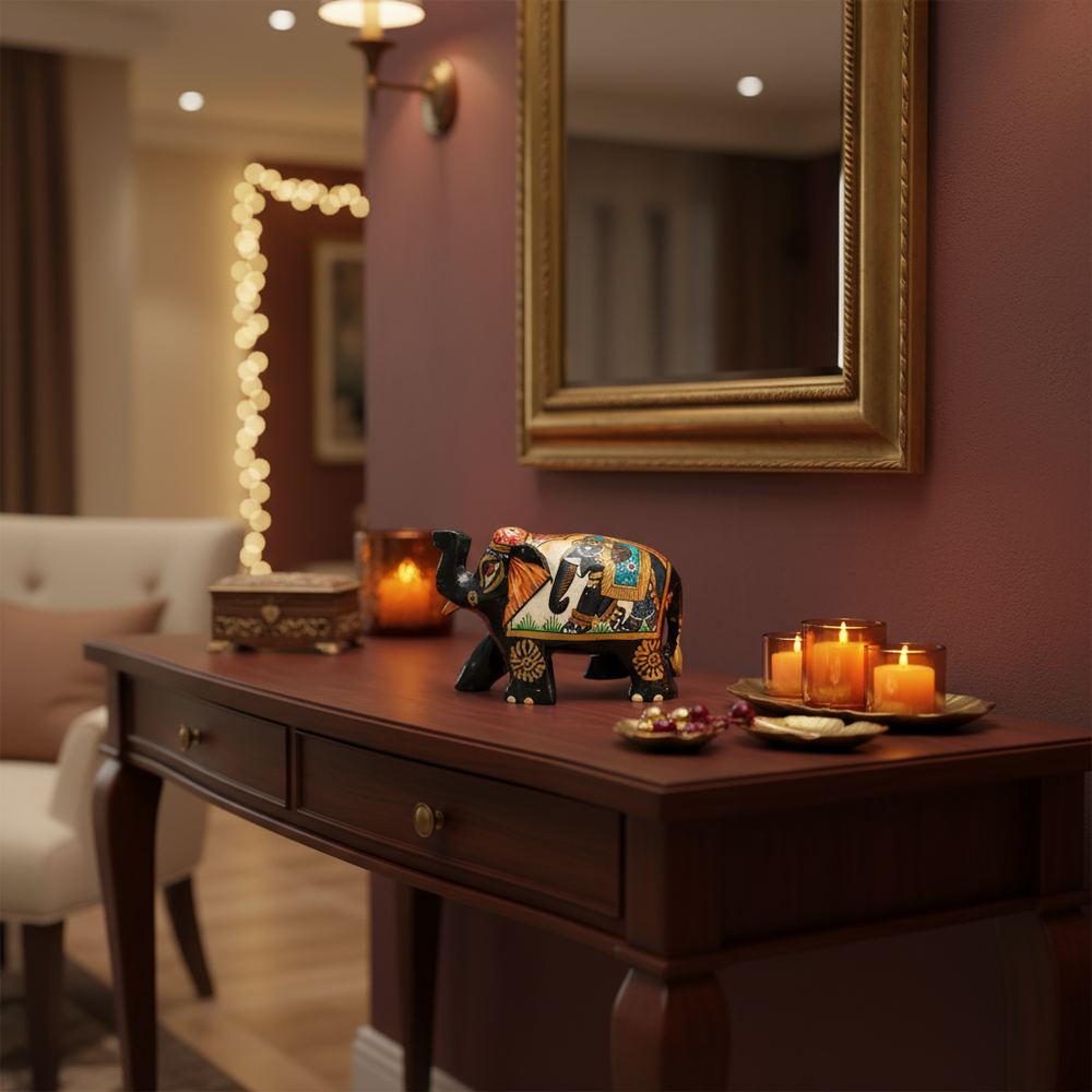 Each piece is meticulously carved from high-quality Sheesham (Indian Rosewood) or Mango Wood, known for durability and beautiful natural grain. The detailed hand-carved patterns showcase floral motifs, royal elephants, peacocks, and temple-inspired designs, capturing the essence of Rajasthani tradition and royal craftsmanship.