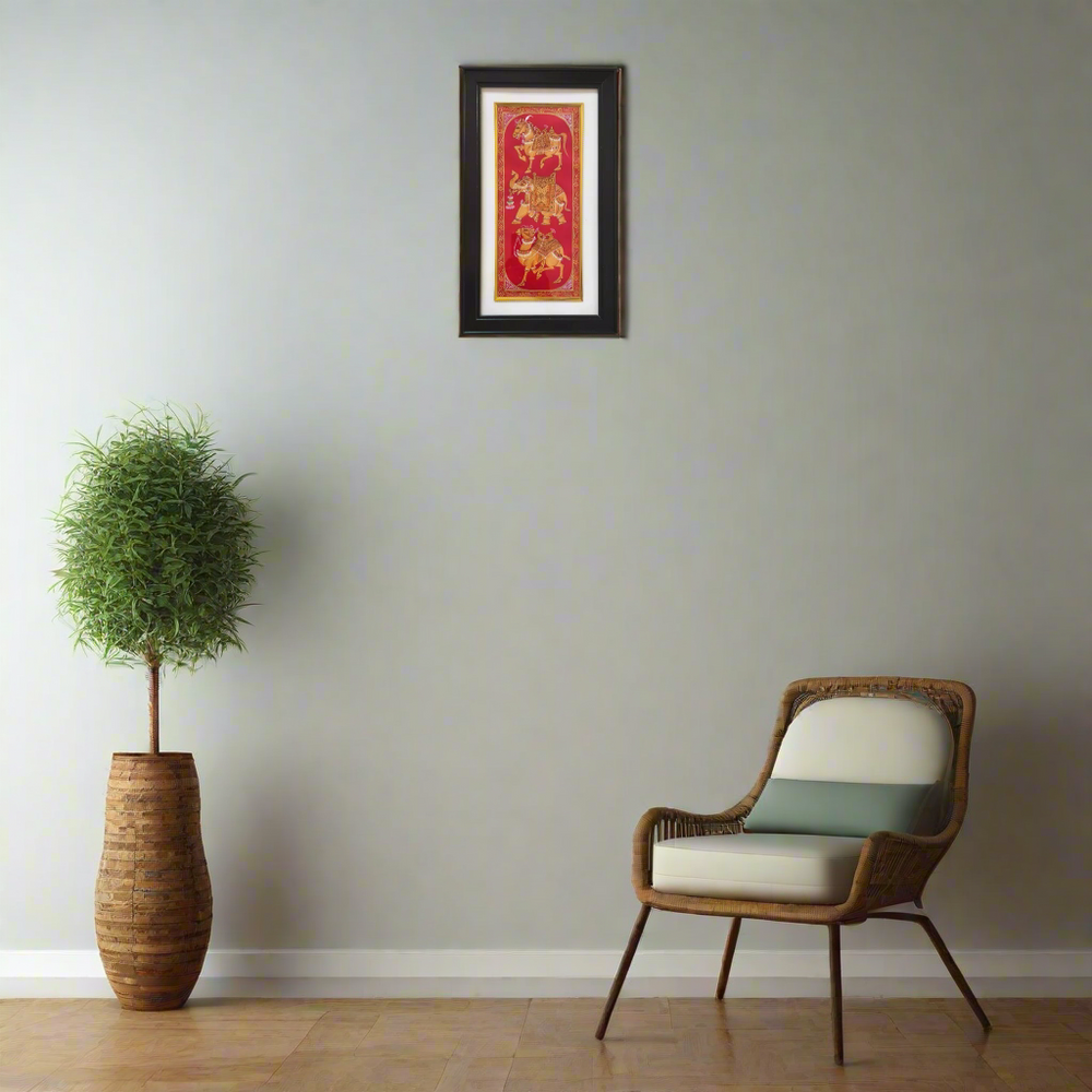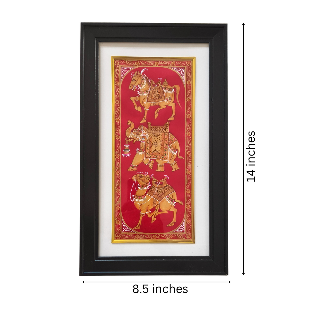 Rajasthani Painting is a rich and vibrant style of Indian miniature painting that flourished in the royal courts of Rajasthan from the 16th century onwards. Deeply rooted in Indian traditions, it portrays themes of mythology, epics, love stories, royal life, and folk culture. The paintings are known for their bold lines, bright colors, and intricate detailing. Natural dyes and pigments made from minerals, vegetables, and precious stones were traditionally used, which gives the art a lasting and luminous quality.