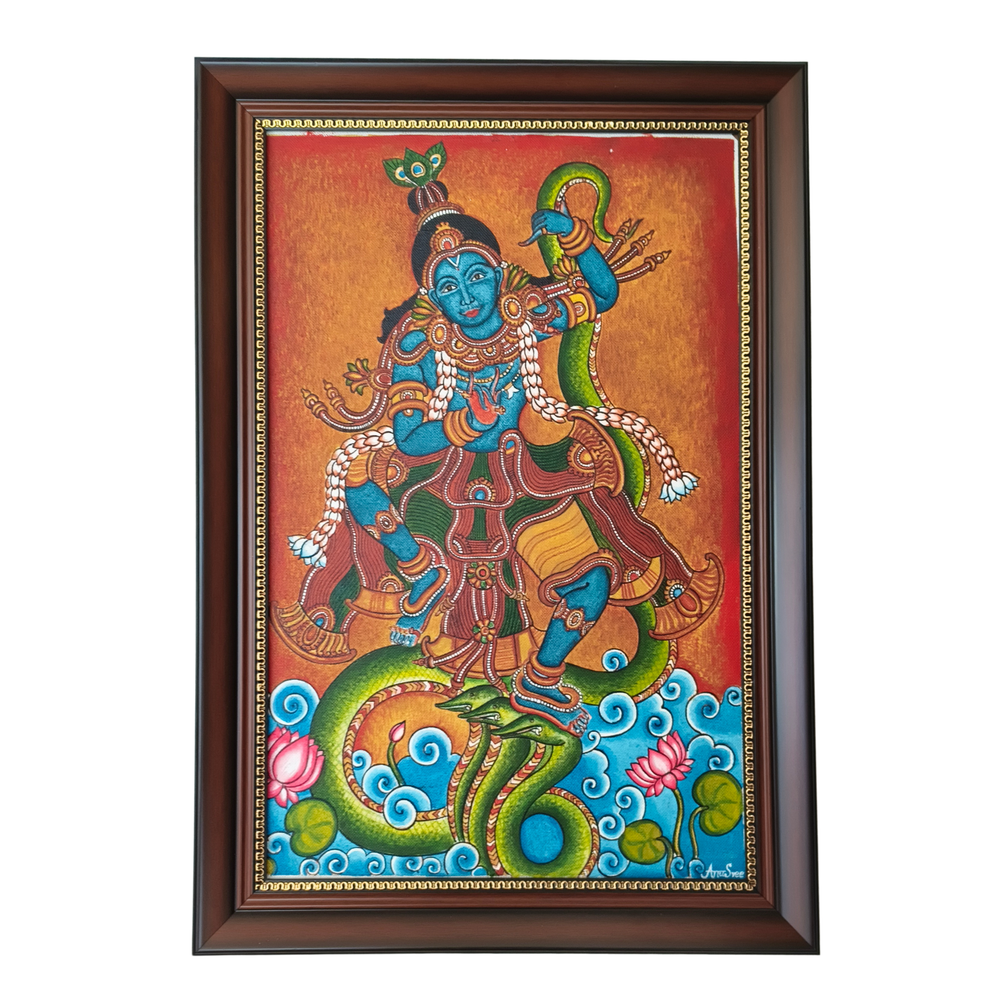 Kerala mural paintings are a rich and vibrant tradition of wall paintings that originated in the Indian state of Kerala, flourishing between the 9th and 12th centuries CE. These murals are deeply rooted in Hindu temple art, known for their mythological themes, elaborate detailing, and earthy color palette.