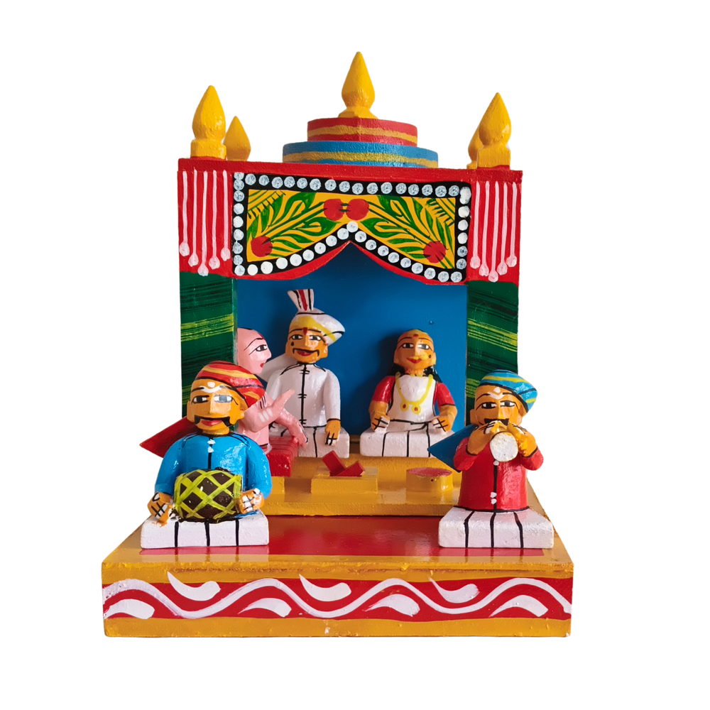 Kondapalli Bommalu are one of the most celebrated traditional wooden toys of India, originating from Kondapalli village in the Krishna district of Andhra Pradesh. These toys are handcrafted from a special softwood known locally as Tella Poniki, which grows in the nearby Kondapalli hills. The craft has a rich heritage dating back over 400 years, believed to have been introduced by migrant artisans from Rajasthan who brought with them unique wood-carving techniques. Each toy is made with meticulous skill, beginning with carving the wood into desired forms, followed by assembling, polishing, and finally painting with vibrant natural or vegetable dyes. The artisans, called Aryakshatriyas, have preserved this tradition for generations, passing it down as a hereditary craft. Kondapalli Bommalu are known for their lively themes inspired by mythology, village life, animals, birds, and deities, reflecting the cultural ethos of Andhra Pradesh. They are most prominently displayed during the festival of Sankranti and Navaratri, especially in the traditional “Bommala Koluvu” (doll arrangement). The toys are lightweight, eco-friendly, and crafted with an aesthetic that blends simplicity with folk charm.Kondapalli Bommalu represent not only the creativity of rural artisans but also a sustainable art form deeply rooted in Indian tradition. Over centuries, the craft has adapted while retaining its original soul, and today, these dolls are treasured as heritage collectibles and cultural symbols worldwide. They embody a timeless legacy where wood, color, and imagination come together to narrate the tales of Indian tradition, art, and spirituality.