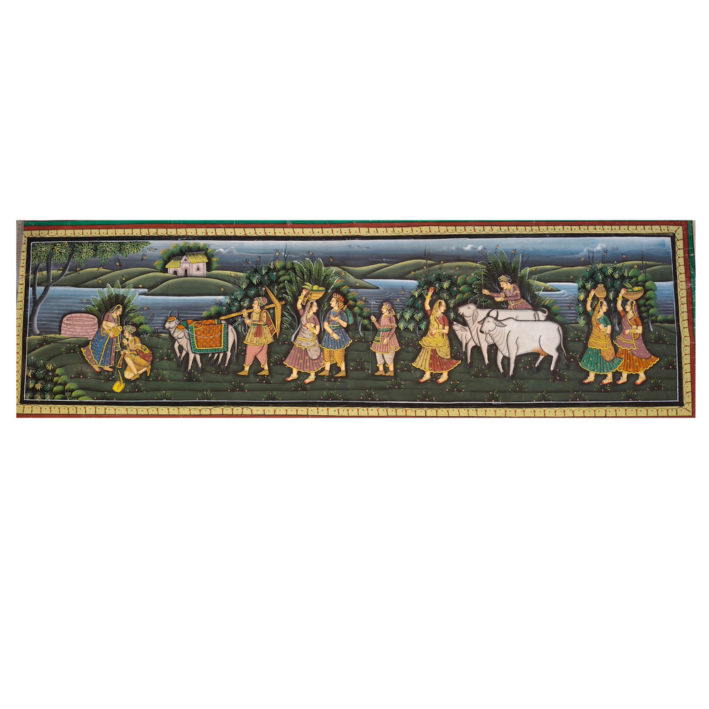 Rajasthani Painting is a rich and vibrant style of Indian miniature painting that flourished in the royal courts of Rajasthan from the 16th century onwards. Deeply rooted in Indian traditions, it portrays themes of mythology, epics, love stories, royal life, and folk culture. The paintings are known for their bold lines, bright colors, and intricate detailing. Natural dyes and pigments made from minerals, vegetables, and precious stones were traditionally used, which gives the art a lasting and luminous quality.
