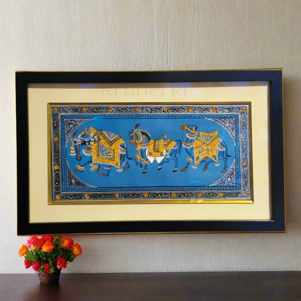 Rajasthani Painting is a rich and vibrant style of Indian miniature painting that flourished in the royal courts of Rajasthan from the 16th century onwards. Deeply rooted in Indian traditions, it portrays themes of mythology, epics, love stories, royal life, and folk culture. The paintings are known for their bold lines, bright colors, and intricate detailing. Natural dyes and pigments made from minerals, vegetables, and precious stones were traditionally used, which gives the art a lasting and luminous quality.