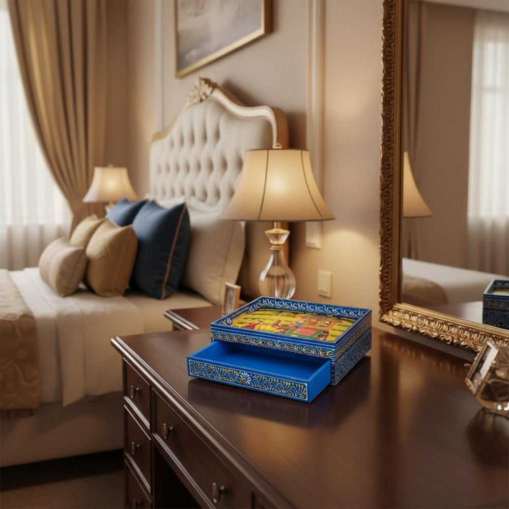 Each piece is meticulously carved from high-quality Sheesham (Indian Rosewood) or Mango Wood, known for durability and beautiful natural grain. The detailed hand-carved patterns showcase floral motifs, royal elephants, peacocks, and temple-inspired designs, capturing the essence of Rajasthani tradition and royal craftsmanship.