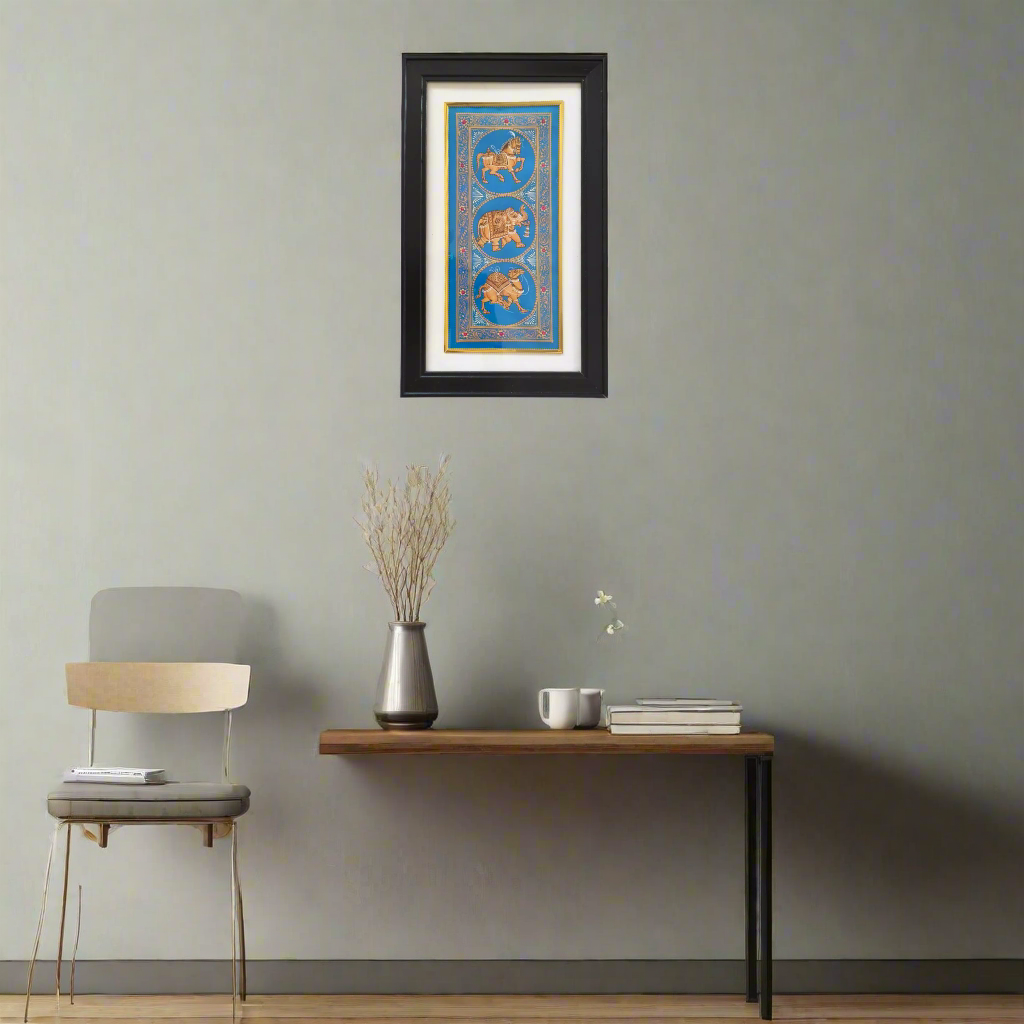 Rajasthani Painting is a rich and vibrant style of Indian miniature painting that flourished in the royal courts of Rajasthan from the 16th century onwards. Deeply rooted in Indian traditions, it portrays themes of mythology, epics, love stories, royal life, and folk culture. The paintings are known for their bold lines, bright colors, and intricate detailing. Natural dyes and pigments made from minerals, vegetables, and precious stones were traditionally used, which gives the art a lasting and luminous quality.