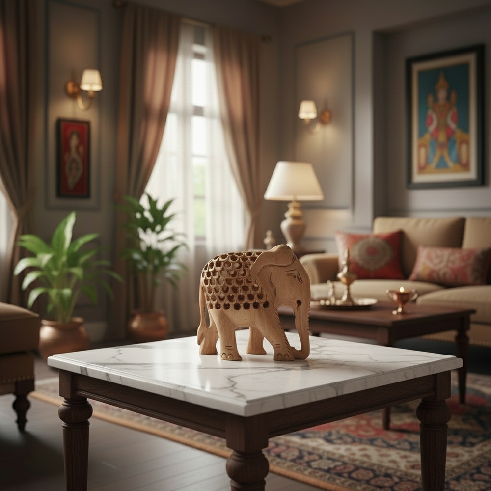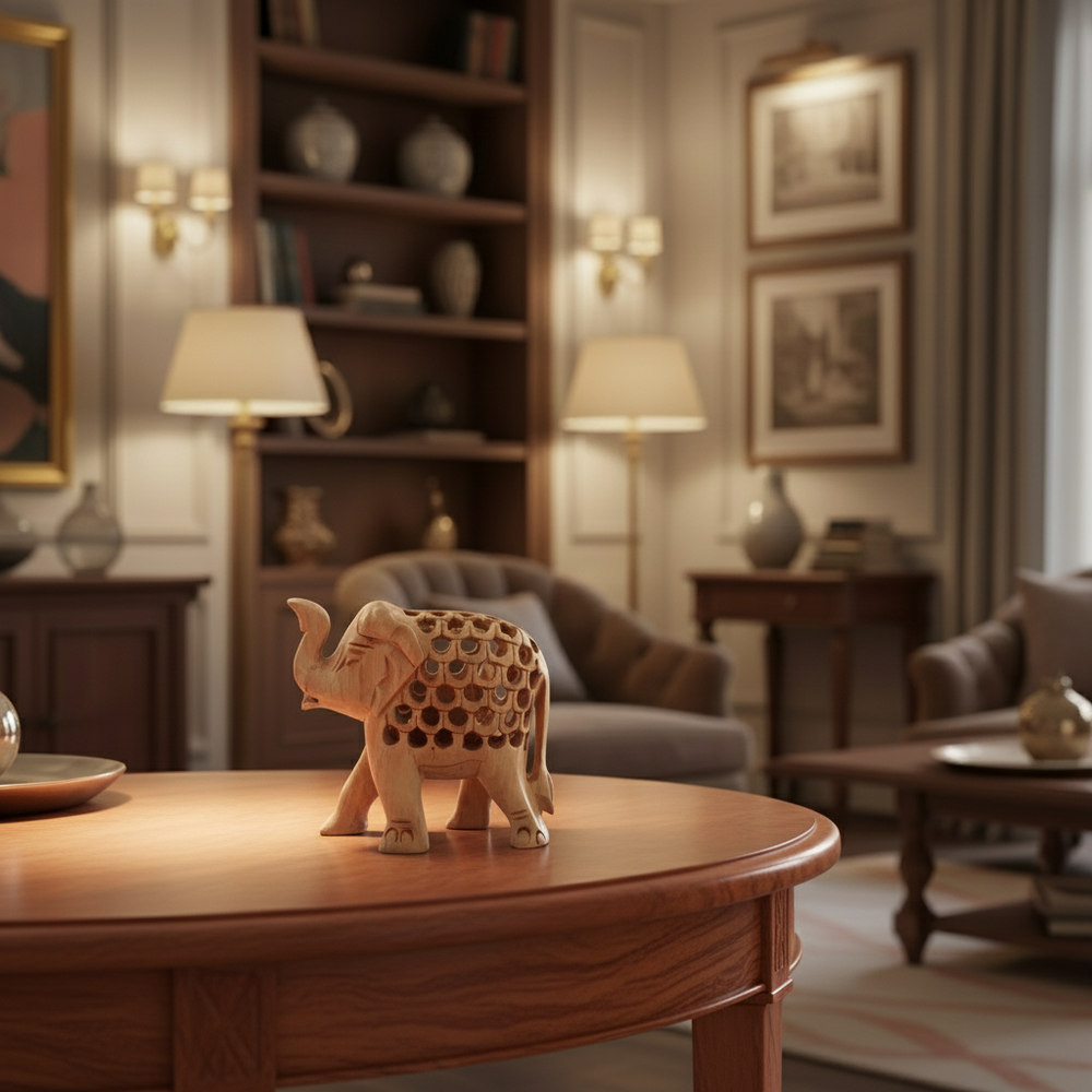 Each piece is meticulously carved from high-quality Sheesham (Indian Rosewood) or Mango Wood, known for durability and beautiful natural grain. The detailed hand-carved patterns showcase floral motifs, royal elephants, peacocks, and temple-inspired designs, capturing the essence of Rajasthani tradition and royal craftsmanship.